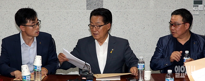 7일, 서울 여의도 국회 의원회관서 박지원 국민의당 원내대표(사진 가운데)가 세월호 유가족 대표들과 세월호 특별법 제정 관련 면담을 갖고 있는 가운데, 전명선 4·16가족협의회 위원장(왼쪽)과 이야기를 나누고 있다.