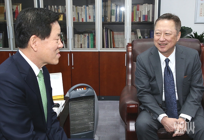 박용만 대한상의 회장(사진 오른쪽)이 23일, 서울 여의도 국회를 찾아 주승용 국민의당 원내대표와 환담을 나누고 있다.