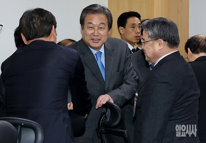 김무성 바른정당 의원이 5일, 서울 여의도 국회서 열린 '해운업 관련 간담회' 직후 참석자들과 악수를 나누고 있다.