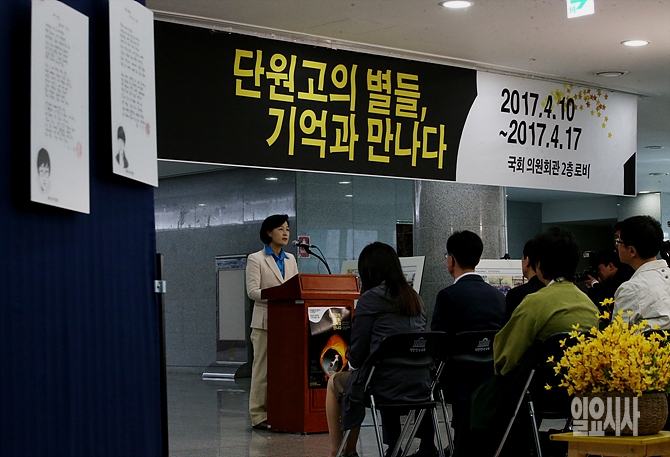 서울 여의도 국회 의원회관 2층 로비서 열린 '4·16 세월호 참사 3주기 기억프로젝트 단원고 희생자 육필 기억시전'에 참석한 추미애 더불어민주당 대표가 인사말을 하고 있다.