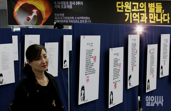 서울 여의도 국회 의원회관 2층 로비서 '4·16 세월호 참사 3주기 기억 프로젝트 단원고 희생자 육필 기억시전'이 열린 가운데 한 시민이 프로젝트를 지켜보고 있다.