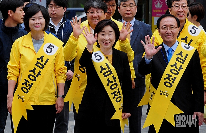 정의당 심상정 대선후보(사진 가운데)가 17일, 노회찬 상임선거위원장, 이정미 의원 등과 함께 서울시 영등포구 여의도 일대서 19대 대선 첫 유세를 갖고 있는 가운데 자신의 기호인 '5'를 손가락으로 펼쳐보이고 있다.