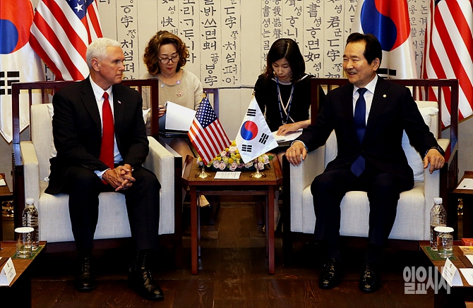 정세균 국회의장이 17일, 서울 여의도 국회를 찾아 예방한 마이크 펜스 미국 부통령과 환담을 나누고 있다. (국회사진취재단)