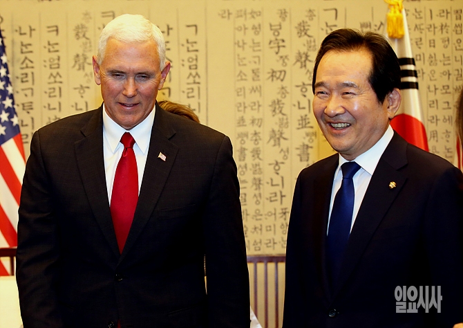 정세균 국회의장이 17일, 서울 여의도 국회를 찾아 예방한 마이크 펜스 미국 부통령과 환담을 나누며 웃음 짓고 있다. (국회사진취재단)