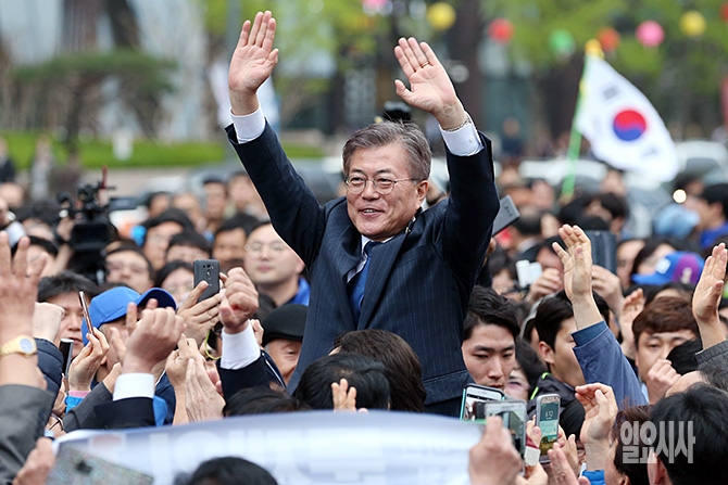 더불어민주당 문재인 대선후보가 17일 오후 서울 종로구 광화문광장에서 열린 집중유세에 참석해 손을 들어 인사를 하고 있다.