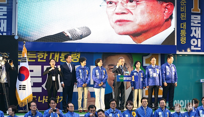 더불어민주당 문재인 대선후보가 17일 오후 서울 종로구 광화문 광장에서 열린 집중유세에 참석해 선거 유세를 하고 있다.