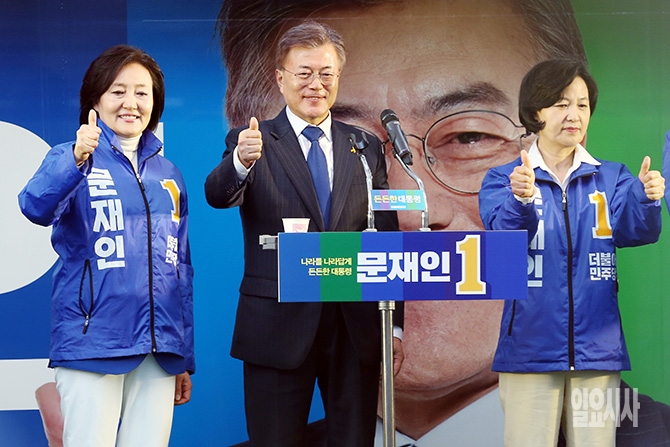 더불어민주당 문재인 대선후보가 17일 오후 서울 종로구 광화문 광장에서 열린 집중유세에서 더불어민주당 박영선 위원과 추미애 대표와 포즈를 취하고 있다.