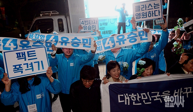 바른정당 유승민 대선후보 캠프 선거유세단이 19일, 서울 여의도 KBS 본관서 예정된 두 번째 대선후보 토론회에 앞서 '팩트폭격기' '대한민국을 바꾸자'라는 등의 피켓을 들고 선거운동을 하고 있다. (국회사진취재단)