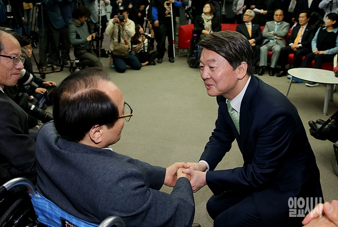 서울 영등포구 여의도동 이룸센터서 20일 열린 '모두를 위한 장애인 복지' 간담회에 참석한 국민의당 안철수 대선후보가 참석자들과 인사를 나누고 있다.