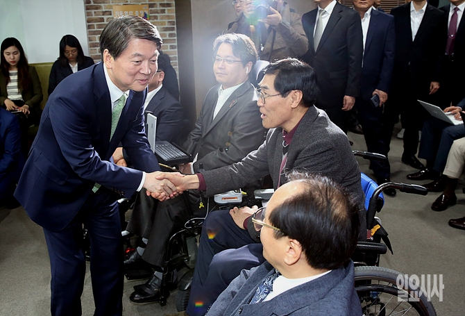 국민의당 안철수 대선후보가 20일, 서울 영등포구 여의도동 이룸센터서 ‘모두를 위한 장애인 복지’ 간담회에 참석해 참석자들과 인사를 나누고 있다.
