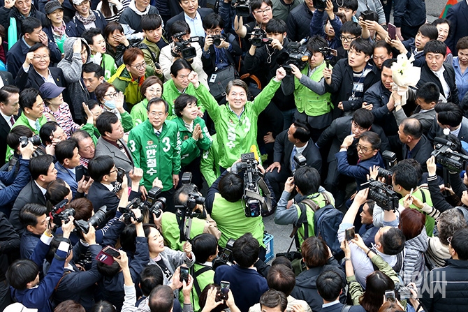 국민의당 안철수 대선후보가 20일 오후 서울 중구 남대문시장에서 열린 집중유세에 참석해 시민들에게 인사를 하고 있다.
