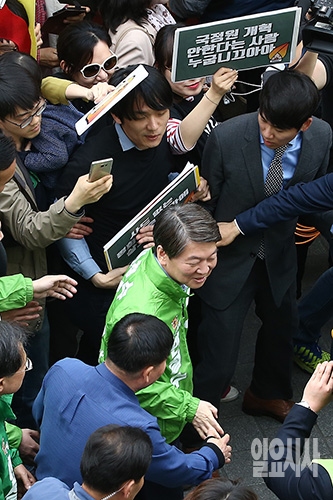 국민의당 안철수 대선후보가 20일 오후 서울 중구 남대문시장에서 열린 집중유세에 참석해 시민들과 인사를 하고 있다.