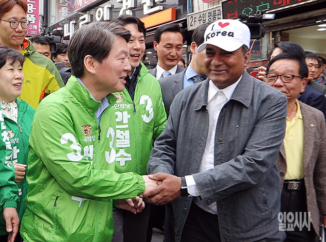 국민의당 안철수 대선후보가 20일 오후 서울 중구 남대문시장에서 열린 집중유세에 참석해 외국인과 악수를 하고 있다.