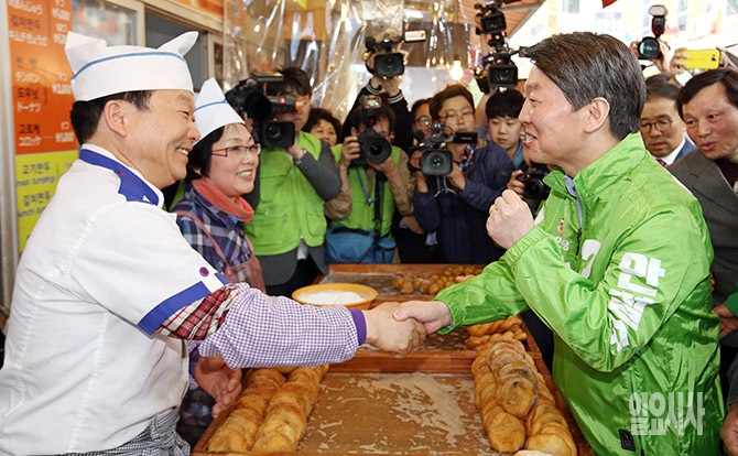 국민의당 안철수 대선후보가 20일 오후 서울 중구 남대문시장에서 열린 집중유세에 참석해 상인과 인사를 하고 있다.