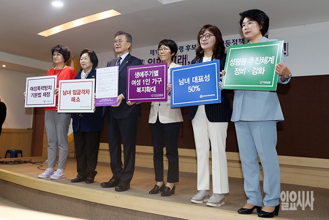 더불어민주당 문재인 대선후보가 21일 오전 서울 용산구 용산 한국여성단체 협의회에서 열린 '모두를 위한 미래, 성평등이 답이다' 대통령 후보 초청 성평등정책 간담회에 참석해 여성단체회장들과 사진을 찍고 있다.
