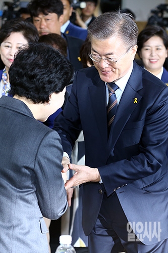 더불어민주당 문재인 대선후보가 21일 오전 서울 용산구 용산 한국여성단체 협의회에서 열린 '모두를 위한 미래, 성평등이 답이다' 대통령 후보 초청 성평등정책 간담회에 참석해 인사를 하고 있다.