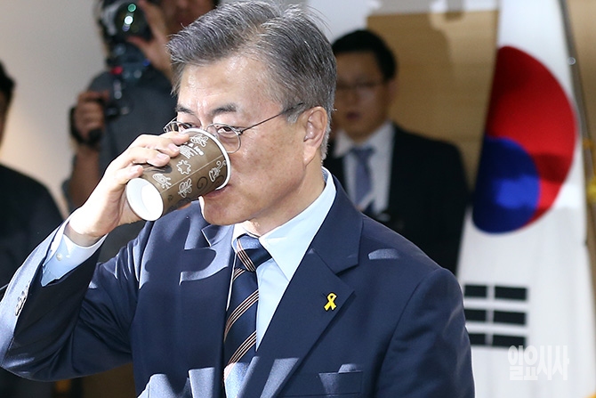 더불어민주당 문재인 대선후보가 21일 오전 서울 용산구 용산 한국여성단체 협의회에서 열린 '모두를 위한 미래, 성평등이 답이다' 대통령 후보 초청 성평등정책 간담회에 참석해 질의응답을 마친 후 물을 마시고 있다.