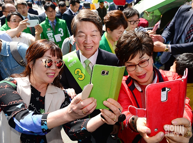 국민의당 안철수 대선후보가 26일 오후 강원도 원주시 문화의 거리에서 열린 집중유세에서 시민들과 사진을 찍고 있다.