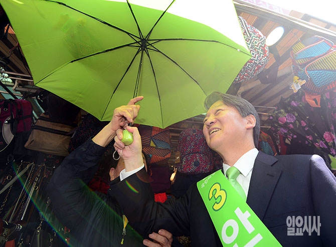국민의당 안철수 대선후보가 26일 오후 강원도 원주시 문화의 거리에서 열린 집중유세에서 녹색 양산을 펼치고 있다.