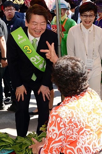국민의당 안철수 대선후보가 26일 오후 강원도 원주시 문화의 거리에서 열린 집중유세에서 상인과 대화를 하고 있다.