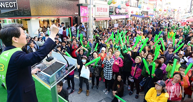국민의당 안철수 대선후보가 26일 오후 강원도 원주시 문화의 거리에서 열린 집중유세에서 지지를 호소하고 있다.