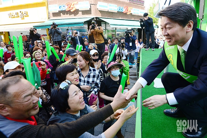 국민의당 안철수 대선후보가 26일 오후 강원도 원주시 문화의 거리에서 열린 집중유세에서 시민들과 악수를 하고 있다.