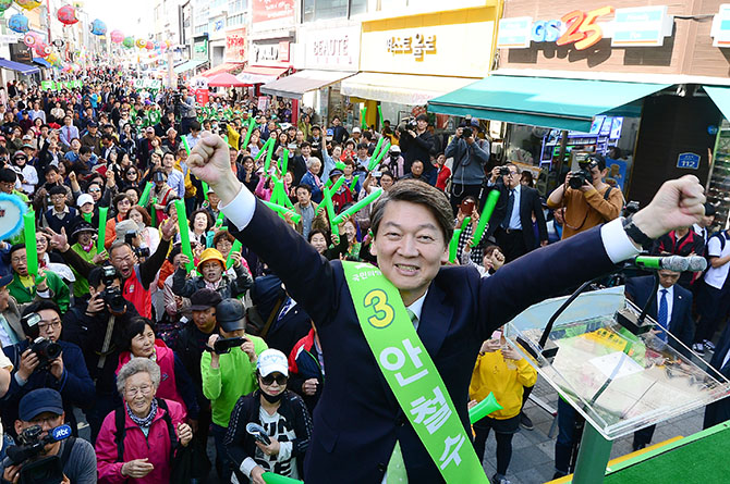 국민의당 안철수 대선후보가 26일 오후 강원도 원주시 문화의 거리에서 열린 집중유세에서 포즈를 취하고 있다.
