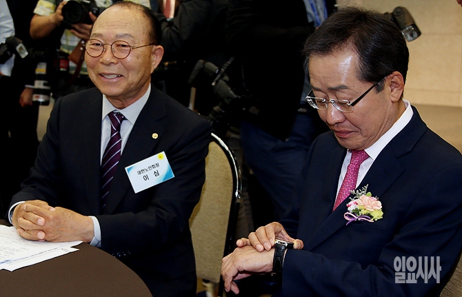 자유한국당 홍준표 대선후보(사진 오른쪽)가 26일, 서울 용산구 백범김구기념관서 열린 대한노인회 대선후보 초청 토론회에 참석해 이심 대한노인회장과 이야기를 나누던 중 시각을 확인하고 있다.