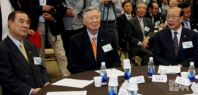 26일, 서울 용산구 백범김구기념관서 열린 대한노인회 대선후보 초청 토론회에 이중근 대한노인회 부회장(사진 가운데)와 최성원 고문 등이 참석해 있다.