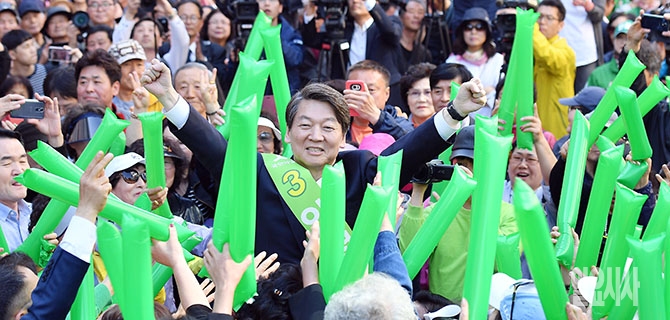 [포토] 녹색 물결 사이에 선 안철수 후보