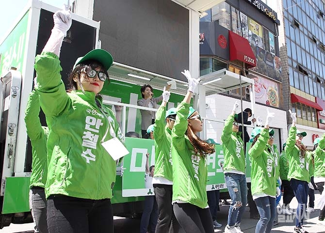 국민의당 안철수 대선후보의 선거지원단이 26일 오후 강원도 춘천시 명동거리에서 열린 집중유세에서 분위기를 띄우고 있다.