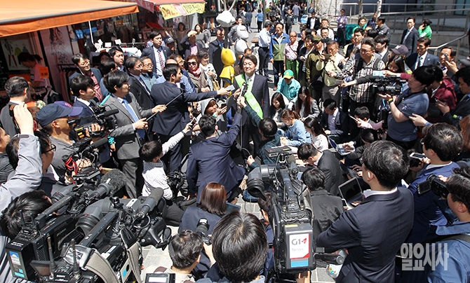 국민의당 안철수 대선후보가 26일 오후 강원도 춘천시 명동거리에서 열린 집중유세에서 매체 인터뷰를 하고 있다.