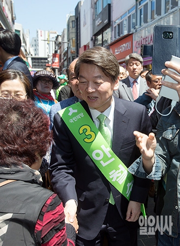 국민의당 안철수 대선후보가 26일 오후 강원도 춘천시 명동거리에서 열린 집중유세에서 시민과 인사를 하고 있다.