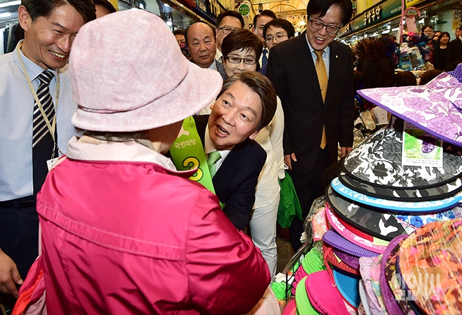 국민의당 안철수 대선후보가 26일 오후 강원도 춘천시 명동거리에서 열린 집중유세에서 시민과 대화를 나누고 있다.