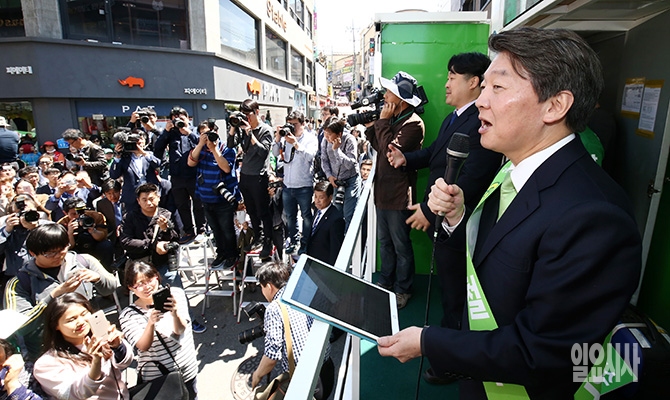 국민의당 안철수 대선후보가 26일 오후 강원도 춘천시 명동거리에서 열린 집중유세에서 지지를 호소하고 있다.