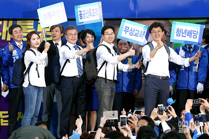 더불어민주당 문재인 대선후보가 27일 오후 경기도 성남시 야탑역 광장에서 열린 집중유세에서 성남시 대표 정책 전달 퍼포먼스를 펼치고 있다.
