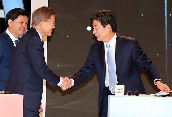 더불어민주당 문재인 대선후보(사진 왼쪽)가 2일, 서울 마포구 MBC 스튜디오서 열린 '중앙선관위 주최 대선후보 TV토론회'에 참석해 바른정당 유승민 후보와 악수를 나누고 있다. (국회사진취재단)