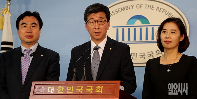 고영진 전 더불어민주당 문재인 대선캠프 대변인(사진 가운데)이 15일, 윤관석 수석대변인(왼쪽), 박경미 대변인과 함께 주요 당직 인선 직후 서울 여의도 국회 정론관서 고별 브리핑을 갖고 있다.