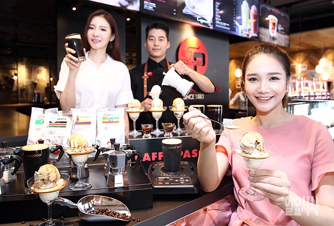 이탈리아 커피전문점 파스쿠찌가 16일 서울 종로구 파스쿠찌 광화문점에서 열린 브랜드 리뉴얼 기념 한정 메뉴 출시 행사에서 모델들이 '모카포트 아포가또'와 '니트로 콜드브루'를 소개하고 있다.