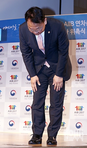유일호 총리 권한대행 겸 경제부총리가 16일 오전 서울 종로 세종로 올레스퀘어에서 열린 '2017 아시아인프라투자은행(AIIB) 연차총회' 서포터즈 발대식 및 홍보대사 위촉식에 참석해 서포터즈에게 인사를 하고 있다.