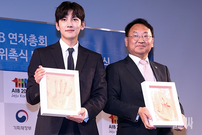 배우 지창욱과 유일호 총리 권한대행 겸 경제부총리가 16일 오전 서울 종로 세종로 올레스퀘어에서 열린 '2017 아시아인프라투자은행(AIIB) 연차총회' 서포터즈 발대식 및 홍보대사 위촉식에 참석해 핸드프린팅을 마치고 포토타임을 갖고 있다.
