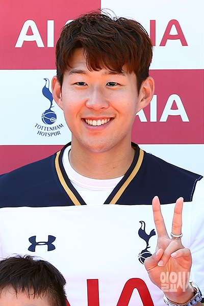 영국 프리미어리그 토트넘 홋스퍼 FC 손흥민 선수가 24일 오후 서울 강서구 가양레포츠센터에서 열린 'AIA 생명과 함께하는 토트넘 선수 방한기념 기자간담회'에 참석해 포토타임을 갖고 있다.