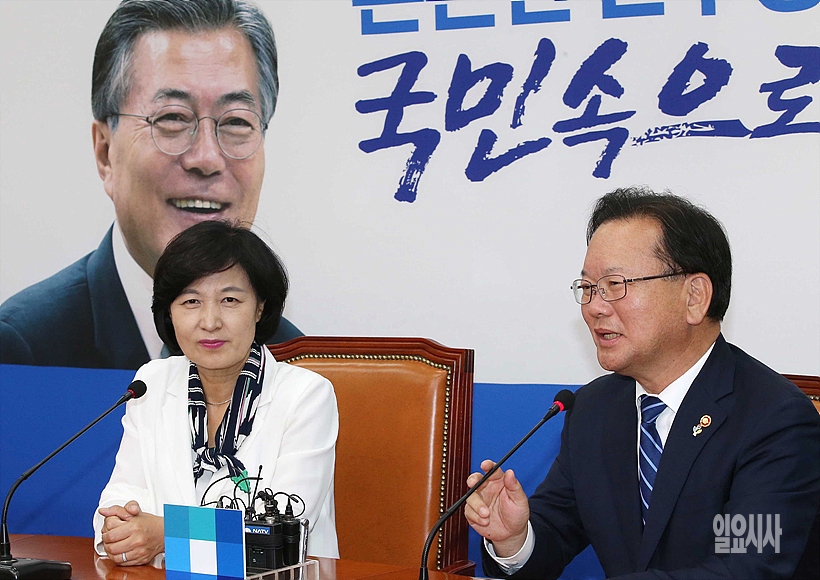 김부겸 행정자치부장관(사진 오른쪽)이 19일, 서울 여의도 국회를 찾아 추미애 더불어민주당 대표를 예방해 잠시 발언하고 있다.