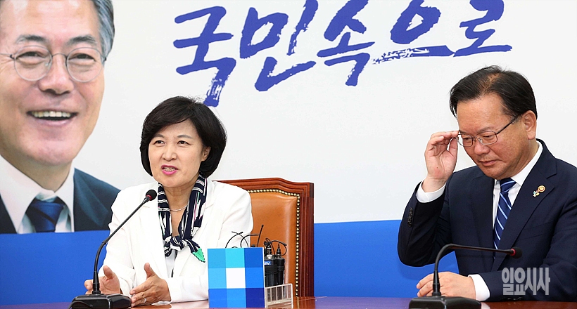 김부겸 행정자치부장관(사진 오른쪽)이 19일, 서울 여의도 국회를 찾아 추미애 더불어민주당 대표를 예방한 가운데 추 대표가 잠시 발언하고 있다.