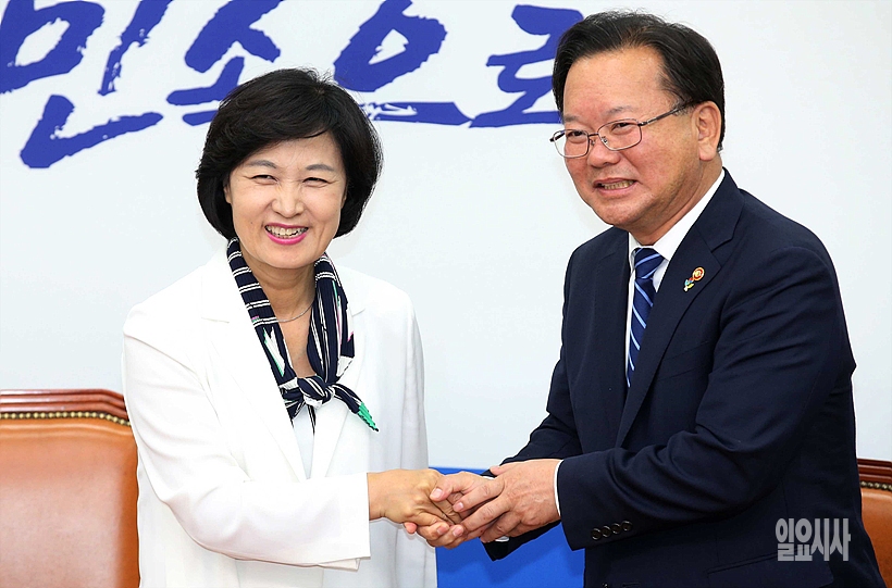 김부겸 행정자치부장관(사진 오른쪽)이 19일, 서울 여의도 국회를 찾아 추미애 더불어민주당 대표를 예방하고 있다.