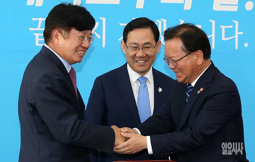 김부겸 행정자치부장관(사진 오른쪽)이 19일, 서울 여의도 국회를 찾아 주호영 바른정당 원내대표 겸 대표 권한대행을 예방한 가운데 이종구 정책위의장과 악수를 나누고 있다.