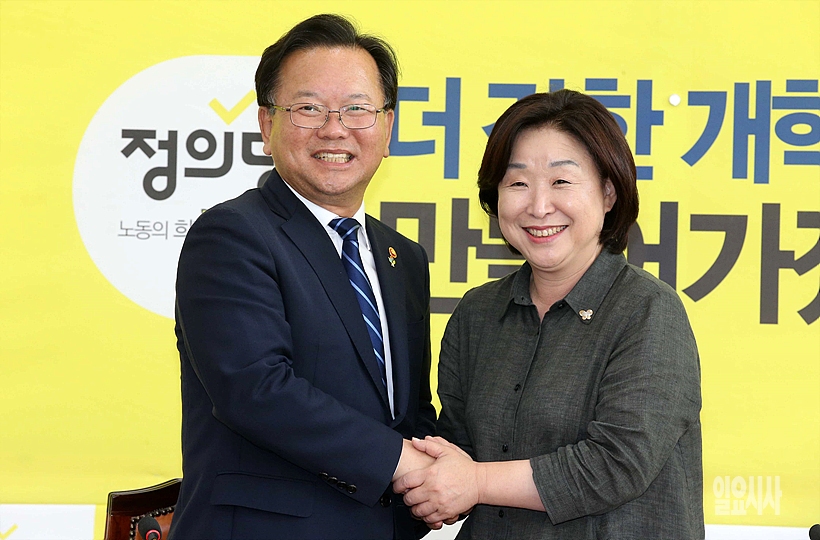 김부겸 행정자치부장관(사진 왼쪽)이 19일, 서울 여의도 국회를 찾아 심상정 정의당 대표를 예방해 악수를 나누고 있다.