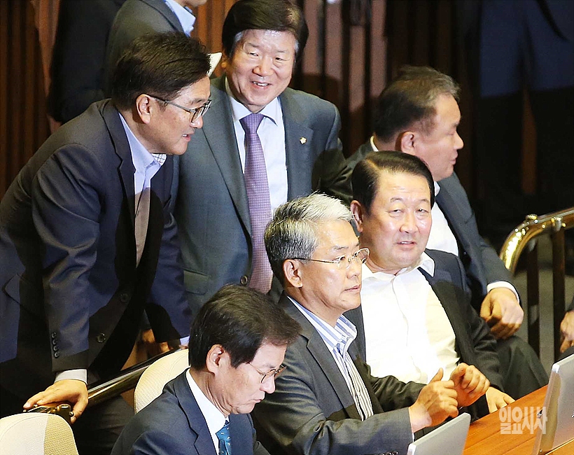 우원식 더불어민주당 원내대표가 18일, 서울 여의도 국회 본회의장서 박주선 비상대책위원장, 김동철 원내대표 석을 찾아가 잠시 이야기를 나누고 있다.