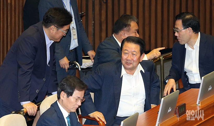 박주선 국민의당 비상대책위원장(사진 가운데)이 18일, 서울 여의도 국회서 열린 본회의에 앞서 우원식 더불어민주당 원내대표와 이야기를 나누고 있다.