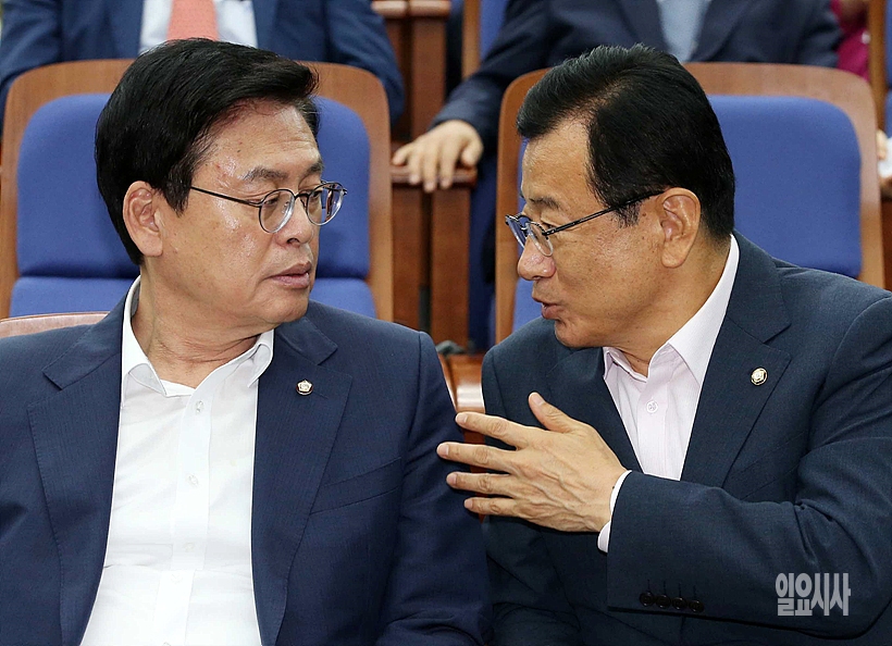 정우택 자유한국당 원내대표(사진 왼쪽)가 18일, 서울 여의도 국회서 열린 '추경예산안 관련' 의원총회에 앞서 이현재 정책위의장과 이야기를 나누고 있다.